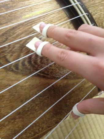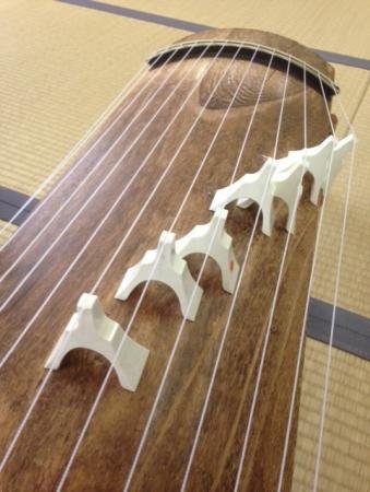 専門の先生に教えていただいています。 上に弦が13本の弦の箏を弾いています。(一七絃の箏もあります)
