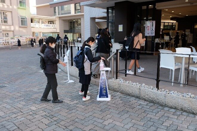 本校では新型コロナウイルスの感染症予防対策として、校内施設の消毒と換気、教職員と来校者の手指消毒と