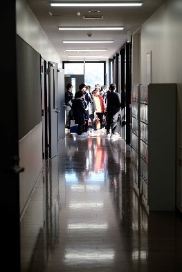 施設見学:保育進学コース(奥は附属幼稚園) 保育実習室前