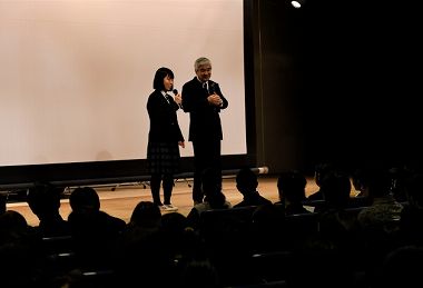 校長挨拶の後、司会者を呼んでインタビュー 受験生の皆さん、最後まで頑張って下さい