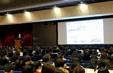 全体の説明会では、オープニングとして、今回は“なぎなた部”による演武、そして理事長、校長の挨拶があり、続いて本校の教育内容や進路等についての概要と共に入試科目の傾向と対策が、教頭より説明されました。