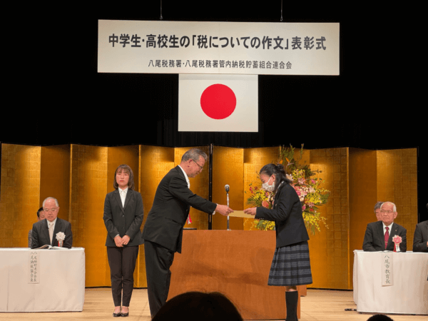 中学生・高校生の「税についての作文」2024/07/05学生生活 本校では、第2学年の生徒たちが夏季休業中の課題として「税に関する高校生の作文」を書き、八尾市に応募しております。例年、入賞した作品は八尾市で表彰されており、昨年度は現3年7組の田頭ほの香さんが「八尾税務署長賞」を受賞しました。以下はその際の様子です。ぜひ今年度の2年生も入賞に向け、優秀な作文を書いて欲しいと思います。 前の記事へトピックス一覧へ次の記事へ トピックスカテゴリー すべてのトピックス お知らせ 学生生活 クラブ活動 入試情報 同窓会(藤蔭会) 2024年7月 月 火 水 木 金 土 日 1234567 891011121314 15161718192021 22232425262728 293031 アーカイブス2025年5月(4)4月(19)3月(7)2月(4)1月(15)2024年12月(17)11月(21)10月(31)9月(7)8月(31)7月(32)6月(52)5月(24)4月(18)3月(11)2月(12)1月(17)2023年12月(29)11月(24)10月(17)9月(20)8月(33)7月(8)6月(35)5月(25)4月(18)3月(11)2月(15)1月(4)2022年12月(43)11月(27)10月(18)9月(9)8月(26)7月(21)6月(34)5月(16)4月(35)3月(18)2月(16)1月(4)2021年12月(31)11月(39)10月(23)9月(3)8月(33)7月(14)6月(7)5月(13)4月(8)3月(18)2月(2)1月(5)2020年12月(30)11月(12)10月(13)9月(5)8月(12)7月(2)6月(7)5月(14)4月(22)3月(6)2月(6)1月(7)2019年12月(5)11月(9)10月(8)9月(11)8月(5)7月(4)6月(17)5月(7)4月(5)3月(2)2月(3)1月(3)2018年12月(3)11月(3)10月(1)9月(4)8月(11)7月(3)6月(16)5月(10)4月(2)3月(1)2月(1)1月(2)2017年11月(3)